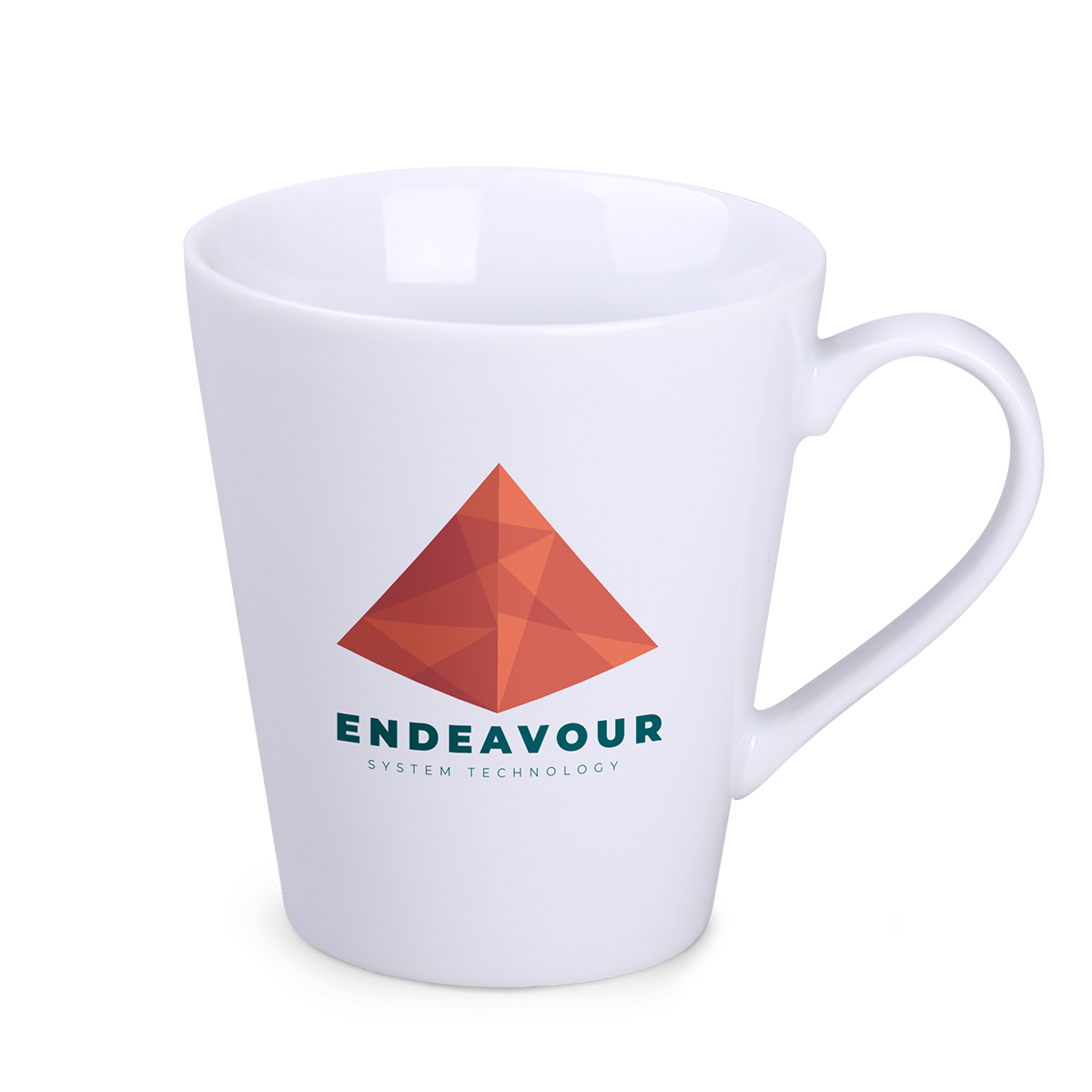 Una tazza capiente con i lati a forma conica che si allargano verso l'alto e con un manico classico.