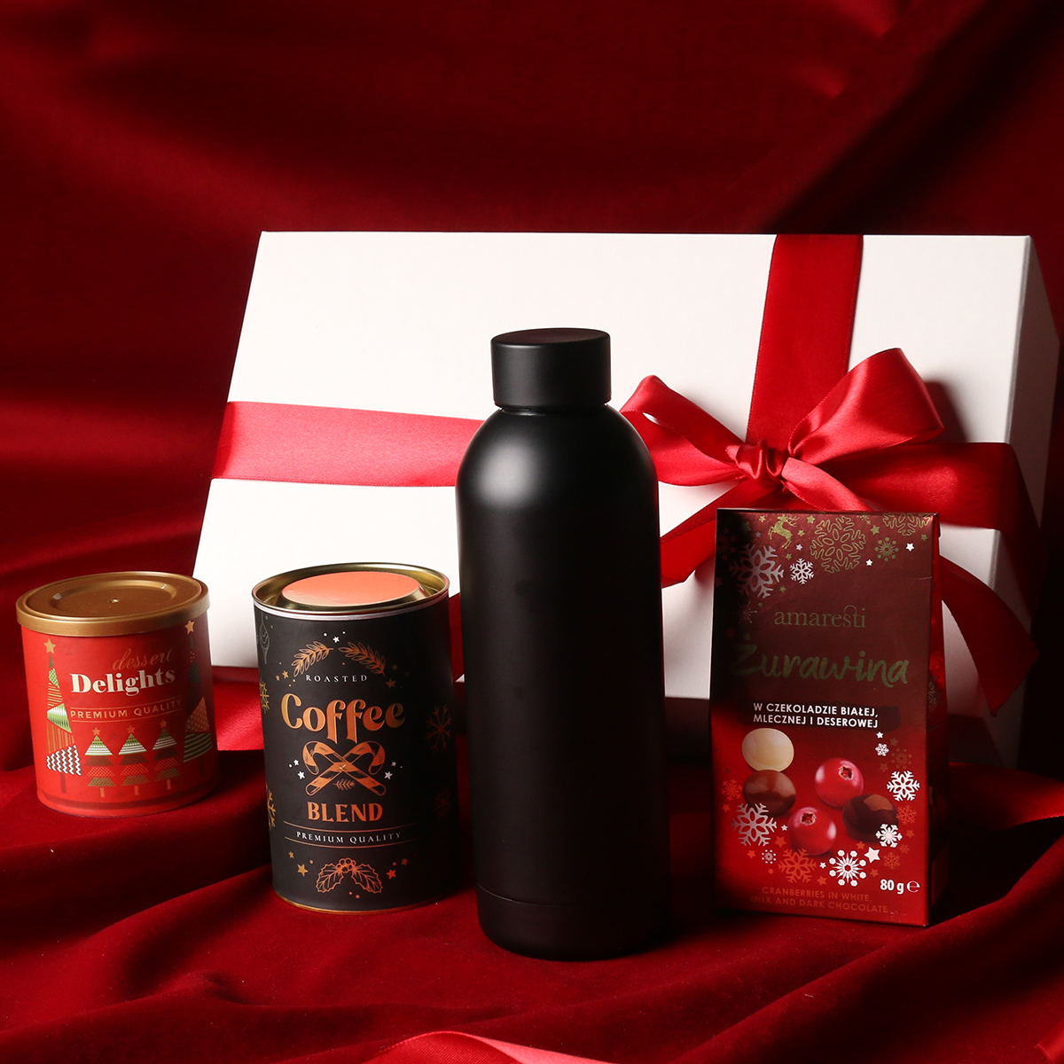 Pratica bottiglia termica Apollo nera Praline di mirtillo rosso in cioccolato bianco, al latte e fondente Caffè in grani aromatico Arabica Brazil Cerrado Mineiro in lattina da 150g Praline Delicate Delights – ribes nero in cioccolato bianco con polvere di lampone 80g Confezione esclusiva con chiusura magnetica e possibilità di aggiungere nastro e fascetta coordinati