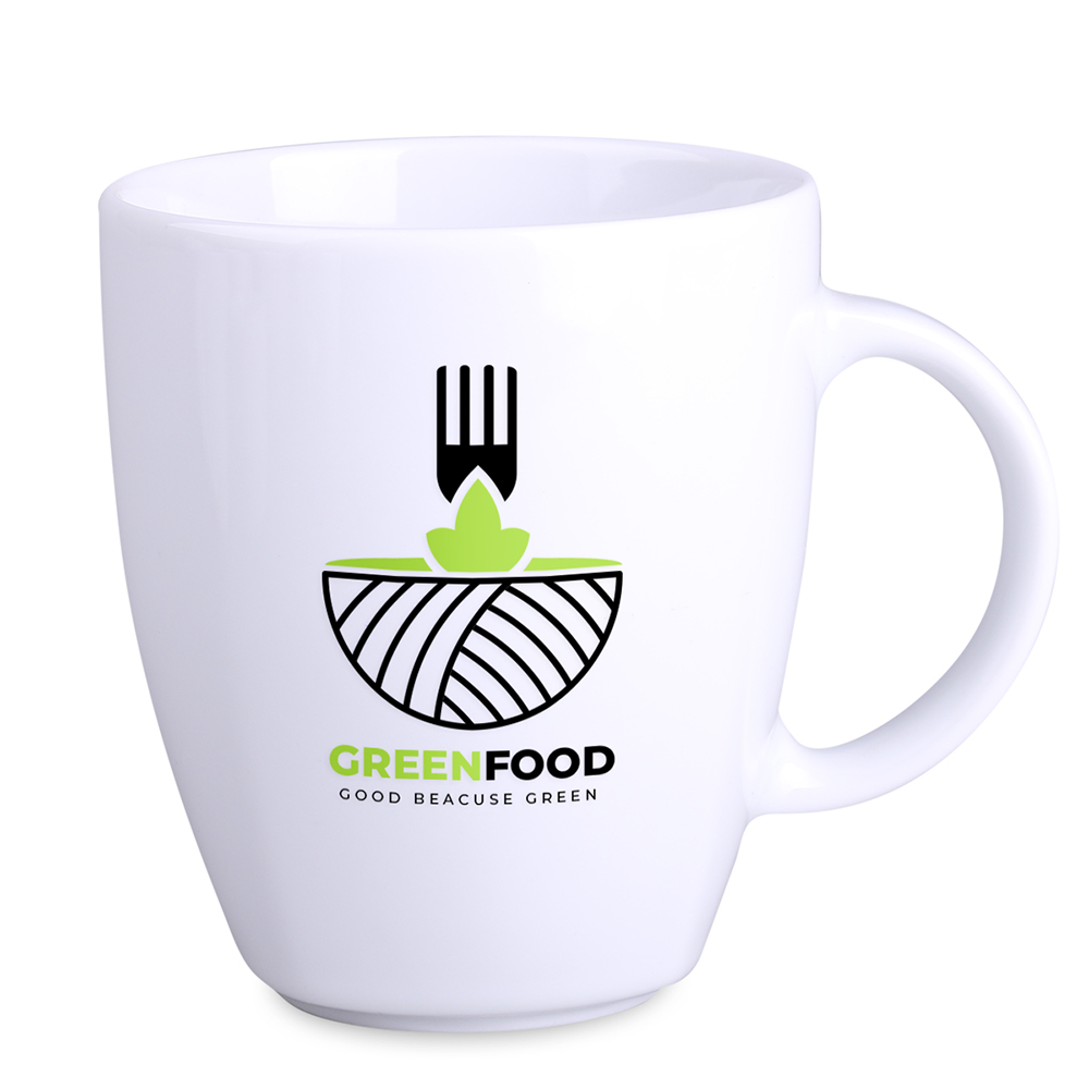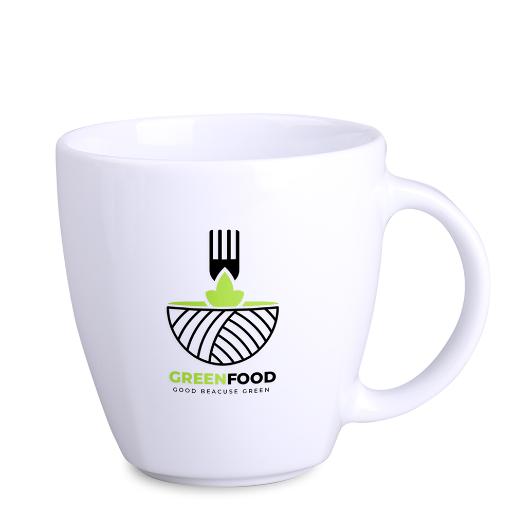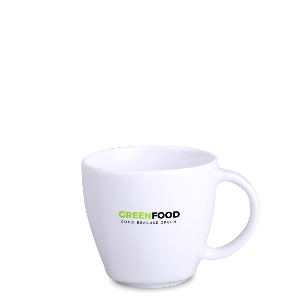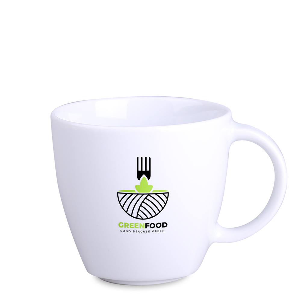 Una tazza promozionale in porcellana disponibile in due misure. Questo modello presenta bordi delicati nella parte inferiore.